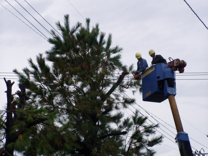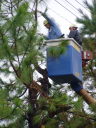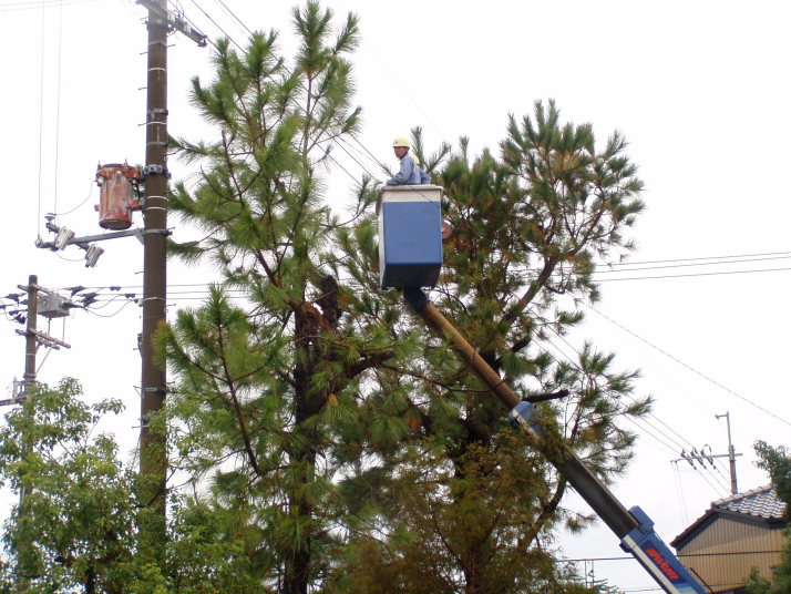 | 11/19 「枝打ちボランティア」 校庭の木が大きくなり電線に引っかかる心配があるため、ボランティアの方に切っていただきました。バケット車3台、ボランティアの方10名で1時間あまりの作業でした。 |