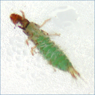 頭の先に肉眼ではほとんど見えないほどの小さなくぼみがあり、 頭・胸は赤茶色をしている。 また、腹は鮮やかなうす緑から緑がかった茶色、または茶色などの色をしている。 主に水中の流下物をほかく網でろ過して食べる。