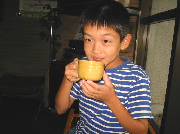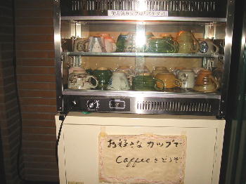 | とてもうれしかったのは、紅茶やココア、コーヒーの自動販売機で、飲む器を自分で選んで飲めたことです。ぼくは黄瀬戸のマグカップでココアを飲みました。展示品をずっと見ていて、ちょっと疲れていたので、とてもおいしく感じました。 | |
