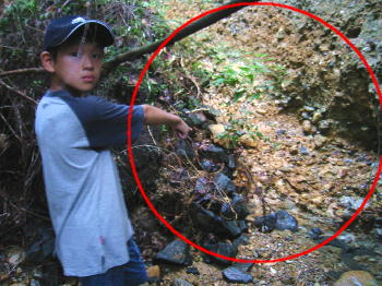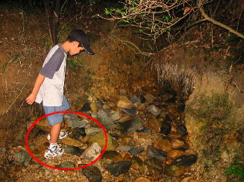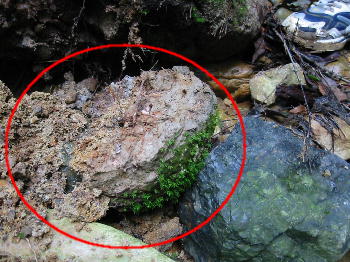 しかし、回りを見てみると、窯の跡?とも思えるような場所がありました。焼き物を焼くと温度が上がり、土が黒っぽくなるので、窯跡かもしれないと思いました。 陶器を焼くときに使う粘土もありました。見つけたお茶碗のかけらは、白瓷のお茶碗のかけらのように思えたので鎌倉時代の山茶碗かもしれません。 |