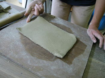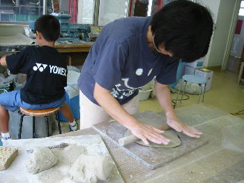 | まだ粘土があまっていたので、お母さんは2つめの作品づくりを始めました。今度は、刺身などをのせる平らなお皿です。粘土をこねたあた、めんぼうで粘土を伸ばしていきました。 | ||
