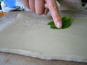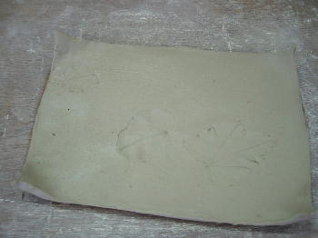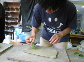 | もう完成したと思ってたら、外から葉っぱを持ってきて、なんとお皿にスタンプみたいに押していきました。お皿には葉っぱのもようがきれいについていたので、すごくきれいでした。 | ||