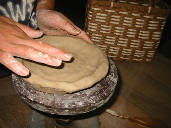 お母さんは、手びねりでお皿を作ることにしました。ぼくが作り方のアドバイスをしました。始めに粘土をこねますが、お母さんは「パン作りを同じだね」と張り切って作り始めました。 |