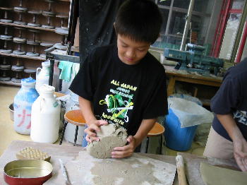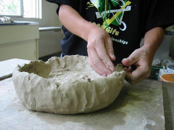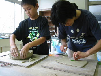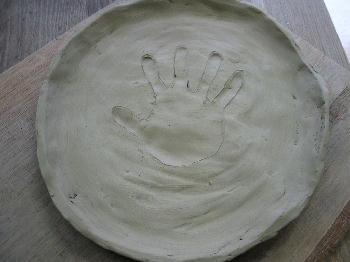 いたらず半分でお皿に手形をつけてみると、けっこうおもしろいもようになってきました。さっそく手形の回りを粘土ベラでふちどりをしました。 でも、ぼくが2つめに作ったお皿の直径は30p以上もあるので、大きすぎてとても素焼きをしてもらえそうにありません。 |