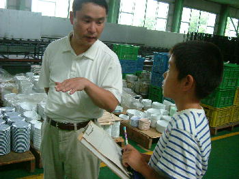 ⇒ この工場で使う素地は、多治見でとれる粘土を使っていません。高田などでとれる粘土は、高田焼きなどの和風の陶器に使われています。この工場では、磁器のカップなどを多く焼いているので、全国だけではなく海外から輸入した原料を混ぜ合わせた素地を買い付けています。 ぼくは美濃の陶磁器工場で使われている素地は、ほとんど美濃の地でとれた粘土を使っているとおもっていたのでビックリしました。原料となる素地が全国や海外から輸入されているのならば陶磁器の工場は別に多治見のある美濃でなくてもいいのではないかと思うようになりました。