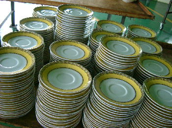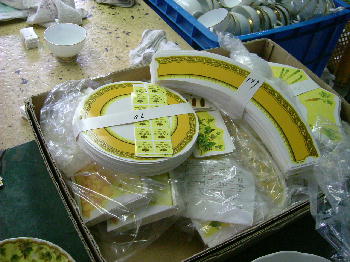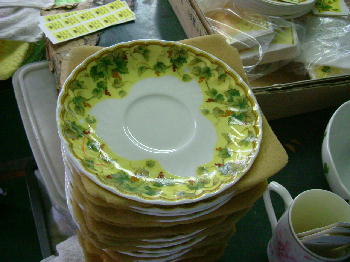 本焼きされたお皿やマグカップに、模様や柄をシールにして1枚1枚ていねいに転写していきました。