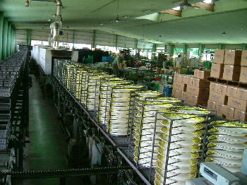 転写されたお皿やマグカップは、ベルトコンベアーにのせられ、トンネル窯で820度で4時間かけてもう一度焼かれます。