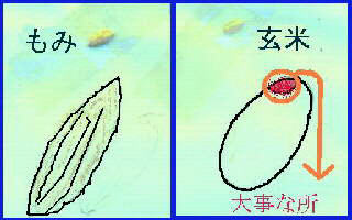お米の種これがお米の種で「もみ」といいます。かたいからをかぶっていてちくちくした毛がはえています。このからをとったものが右側の玄米です。これをさらにむいたのがわたしたちが食べている米で白米といいます。 | |