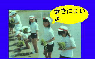 | ぐにょー 始めは長ぐつをはいて田んぼに入りましたが、動きにくいのではだしになりました。足の指の間にどろがぐにょーと入ってきて気持ちわるー。でもだんだん慣れてきました。 | |
