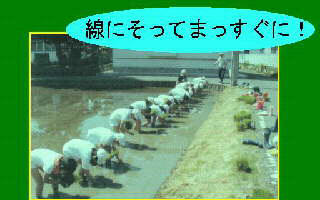 | 3本ずつ、3本ずつ植えました。 ひもにそって一列に並んで植えました。一生懸命植えました。 「腰がいたいよー。」「後ろ向きで歩きにくいよ。」 |