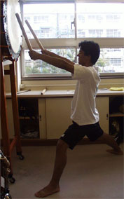 桴先が鼓面の中心にくる位置に立ち、腰を落とし背筋を伸ばす。足は左が前、右が後ろで足の位置を時計の針の10時25分を指す位置に置く。このとき左足を曲げ、右足を伸ばす。
