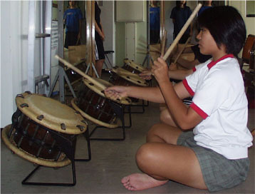 顔は真正面を向き、目線は前で太鼓を見ない。太鼓のリズムに合わせ身体を動かす。