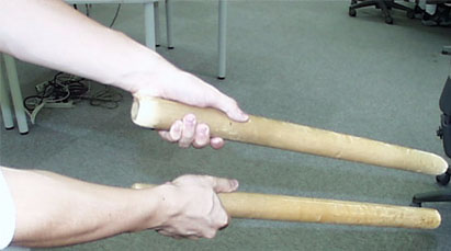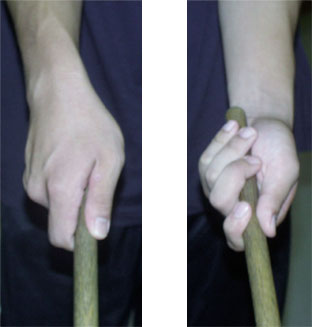 基本的に長胴桴と同じですが、桴が太いため、親指と人さし指は強く握るように持ちます。