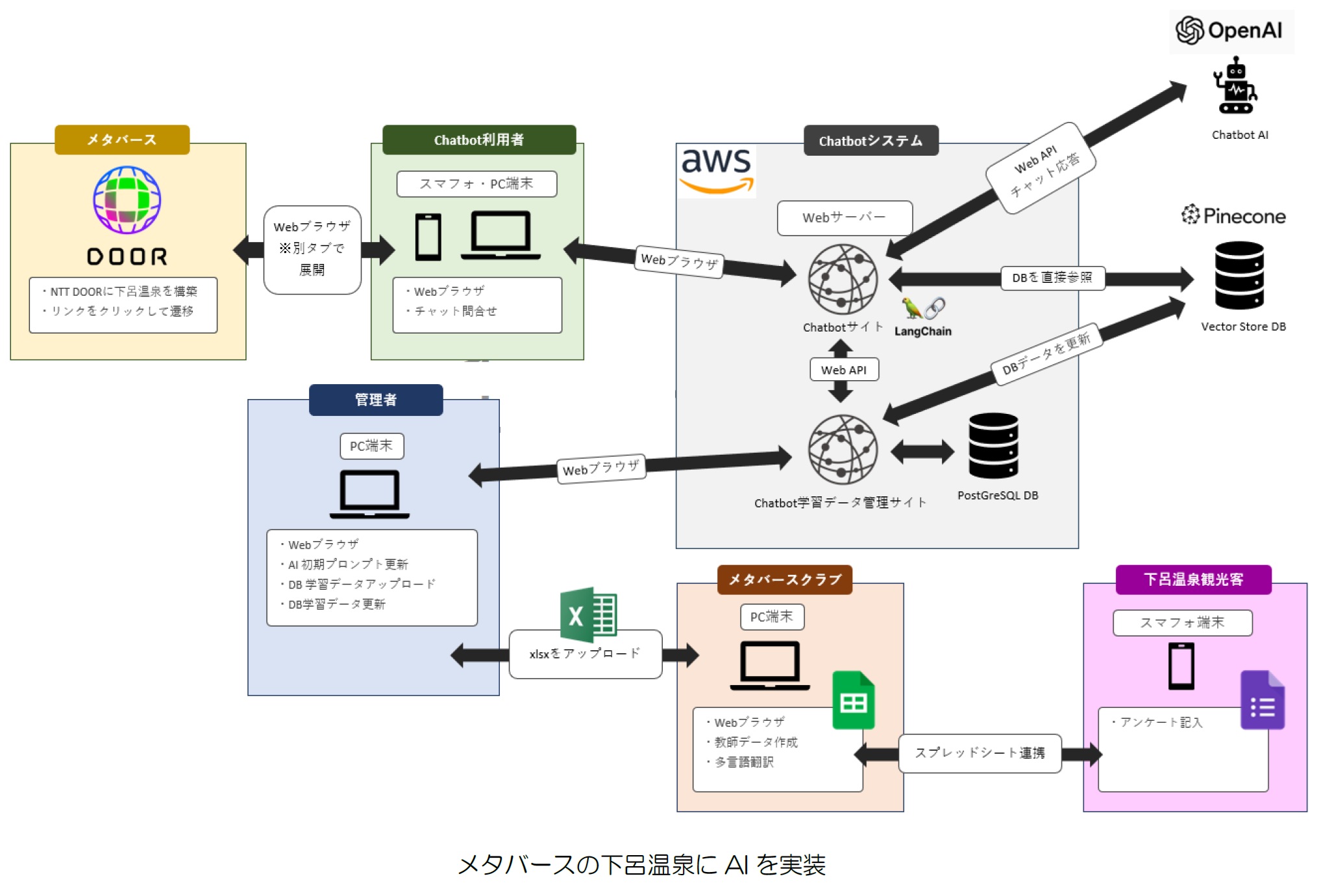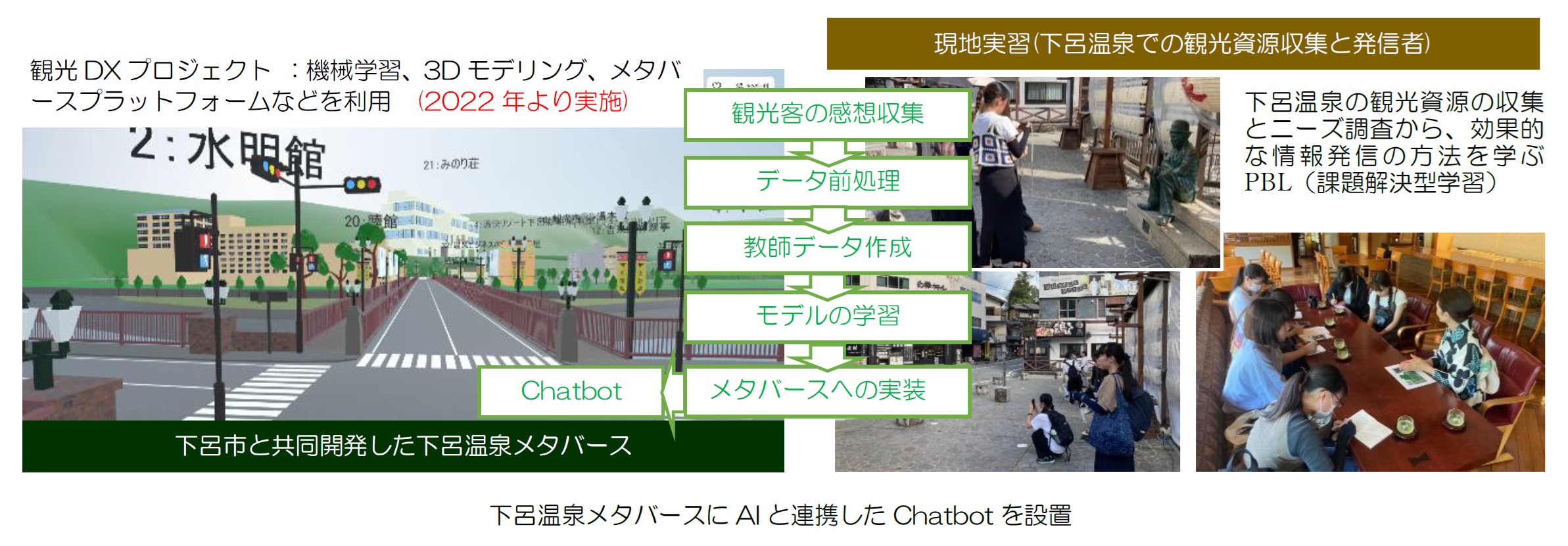 | 下呂温泉での現地実習で女子大生が収集したデータの前処理をして、教師データを作成しました。 女子大学生が見つけた下呂温泉の「みどころ」をAIが回答するために、メタバースにAIを実装しました。 |