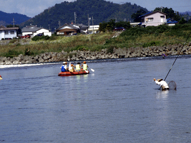 川を下っていると釣りをしている人に会います。邪魔をしないようにしよう。