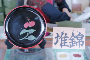 琉球の漆器は、海外交易の盛んな14世紀〜15世紀の頃から始まり、その技術、芸術性が高く評価され、献上品としてまた貿易品として最も喜ばれた品物の一つである。立体的な浮彫表現である「堆錦」技法は、中国の堆朱の技法からヒントを得て、沖縄独特の加飾法として考案された。