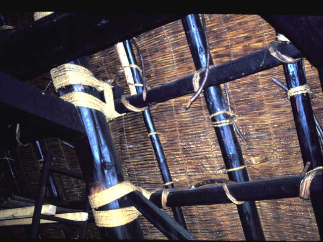 合掌造の屋根には、釘が1本も使われていません。太い合掌桁とそれを補強するヤナカ(横木)・クダリ(縦木)、それらを結びつけているネソ(マンサク)とわらなわによって形成されています。