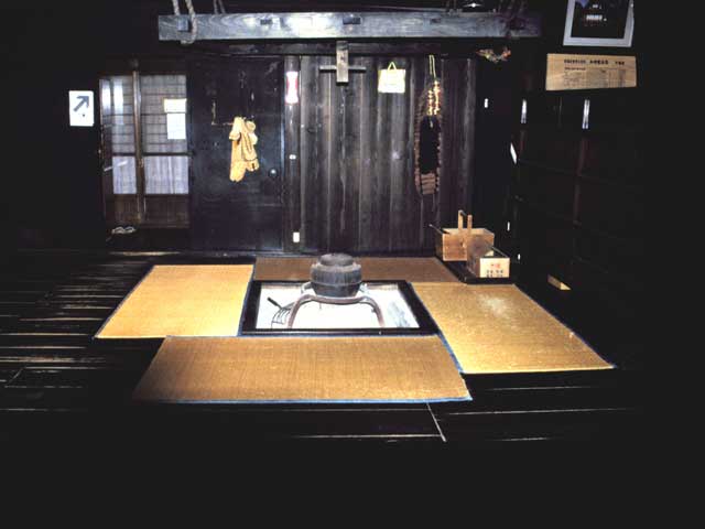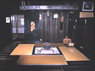 昔は、暖をとる唯一の手段であった囲炉裏です。上にみえる火天(ひやま)は、火の粉があがらないようにする防火の役割を果たしています。