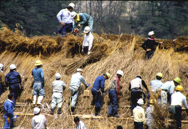 13 フキガヤによって屋根の上まで葺きあげ られた茅は、棟で合わせられます。 これが、ムナガヤです。 |