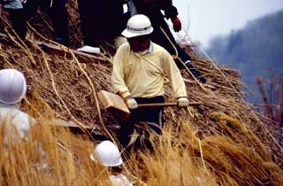 14 一通り茅を葺き終えた後は、はみ出た部分 をチェーンソーで切断するなどして、整え ていきます。 |