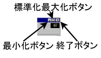 最小化ボタン・・クリックすると最小化される。タスクバーをクリックすると前面に表示される。 標準化最大化ボタン・・クリックすると最大化と標準化に交互に変わる。 終了ボタン・・・クリックするとプログラムが終了する。