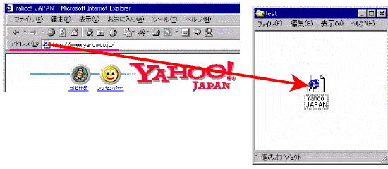 アドレスにあるアイコンをドラックし、フロッピーディスクやデスクトップに放すとホームページのショートカットアイコンができます。次からは、それをクリックするだけでそのページを見ることができます。